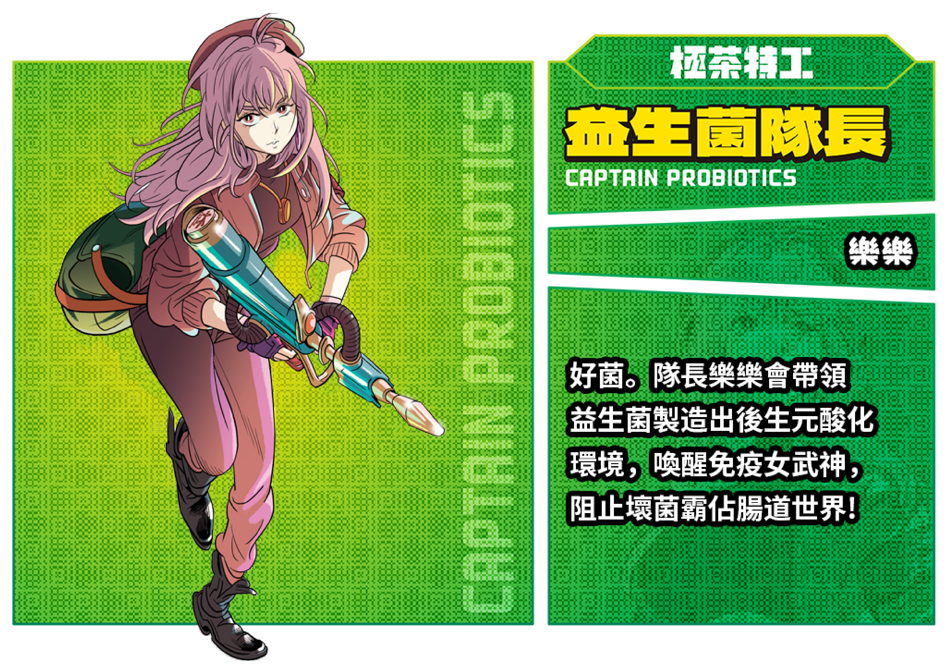 人體腸道世界中,由好菌、壞菌、伺機菌建構而成,他們三方鼎立,需一直保持數量平衝才能維持腸道世界和平。一天,宿主澤生活習慣變差,令潛伏的壞菌Boss乘機發動總攻,企圖稱霸腸道!帶領好菌奮力抵抗的益生菌隊長,因後生元數目及能力不足而苦苦掙扎...